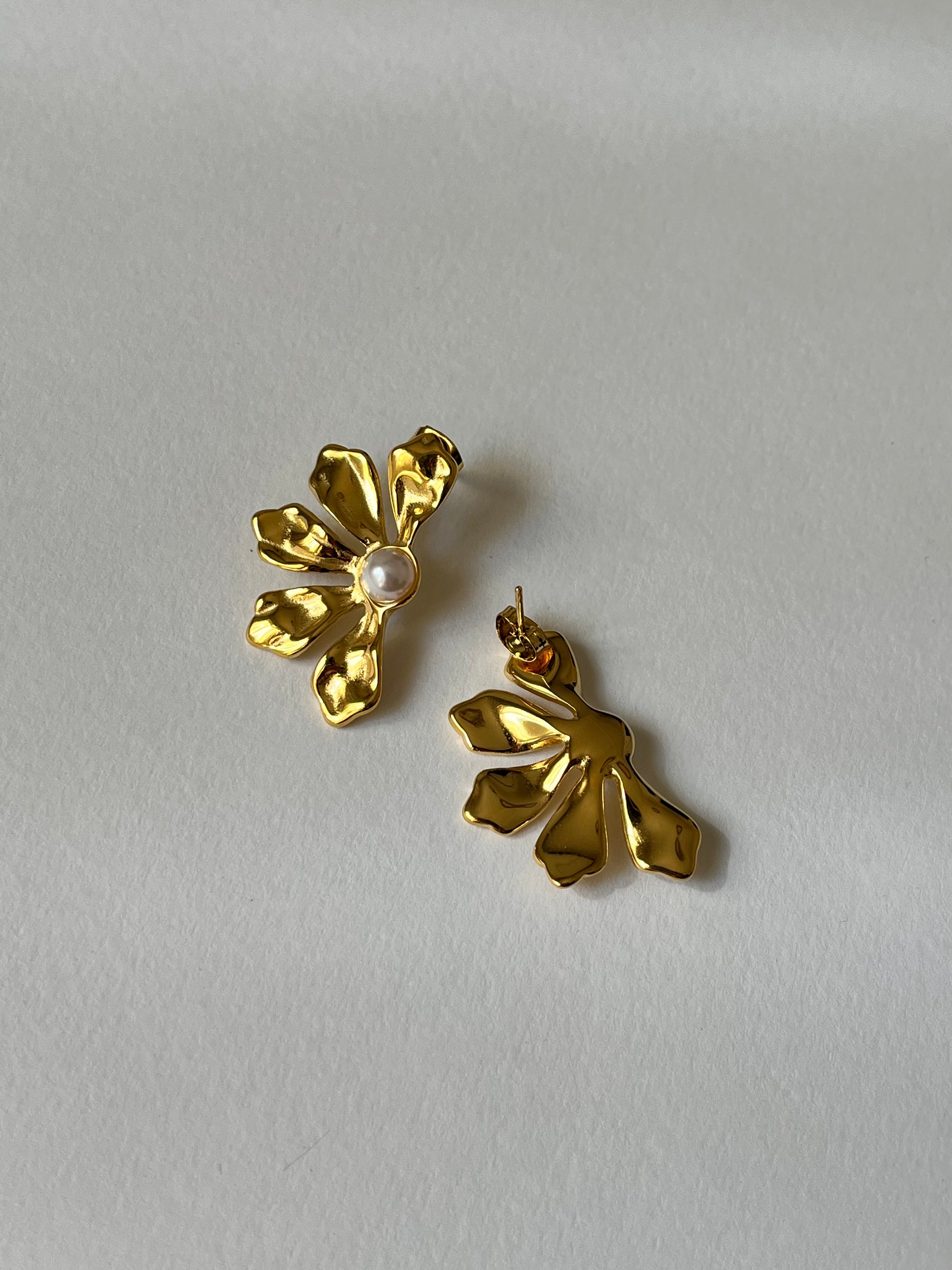 A pair of stud earrings that celebrate our love of spring, the Flora Earrings come in 18k gold-plated or silver, with hypoallergenic studs and post fastening. Their half-flower shape is further accented with a pearly center. This pair is perfect for adding details to a T-shirt and jeans look or as your go-to summer fun pair - tis the season for fun occasions after all!