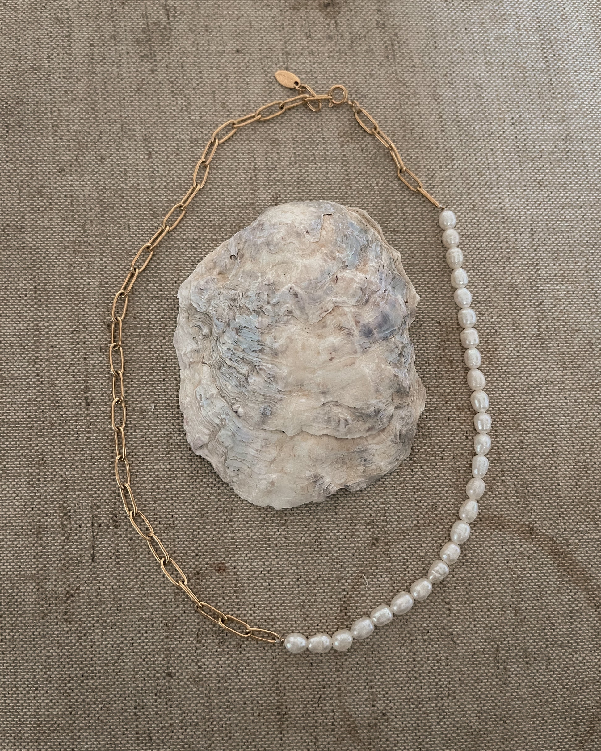 The Sand & Sea Necklace blends contrast and elegance with freshwater pearls on one side and bold gold paperclip links on the other. Crafted from 18K gold-plated stainless steel, this statement pearl necklace is waterproof, hypoallergenic, and made for everyday wear. Whether you style it on its own or in a necklace stack, it’s a standout.
